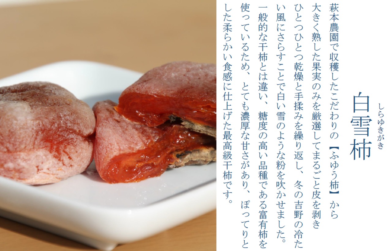 萩本農園の柿で作った、完全無添加ふゆう干柿の中から、大きさ・味・食感の特に良いものだけを厳選して「白雪柿(しらゆきがき)」と名付けました.